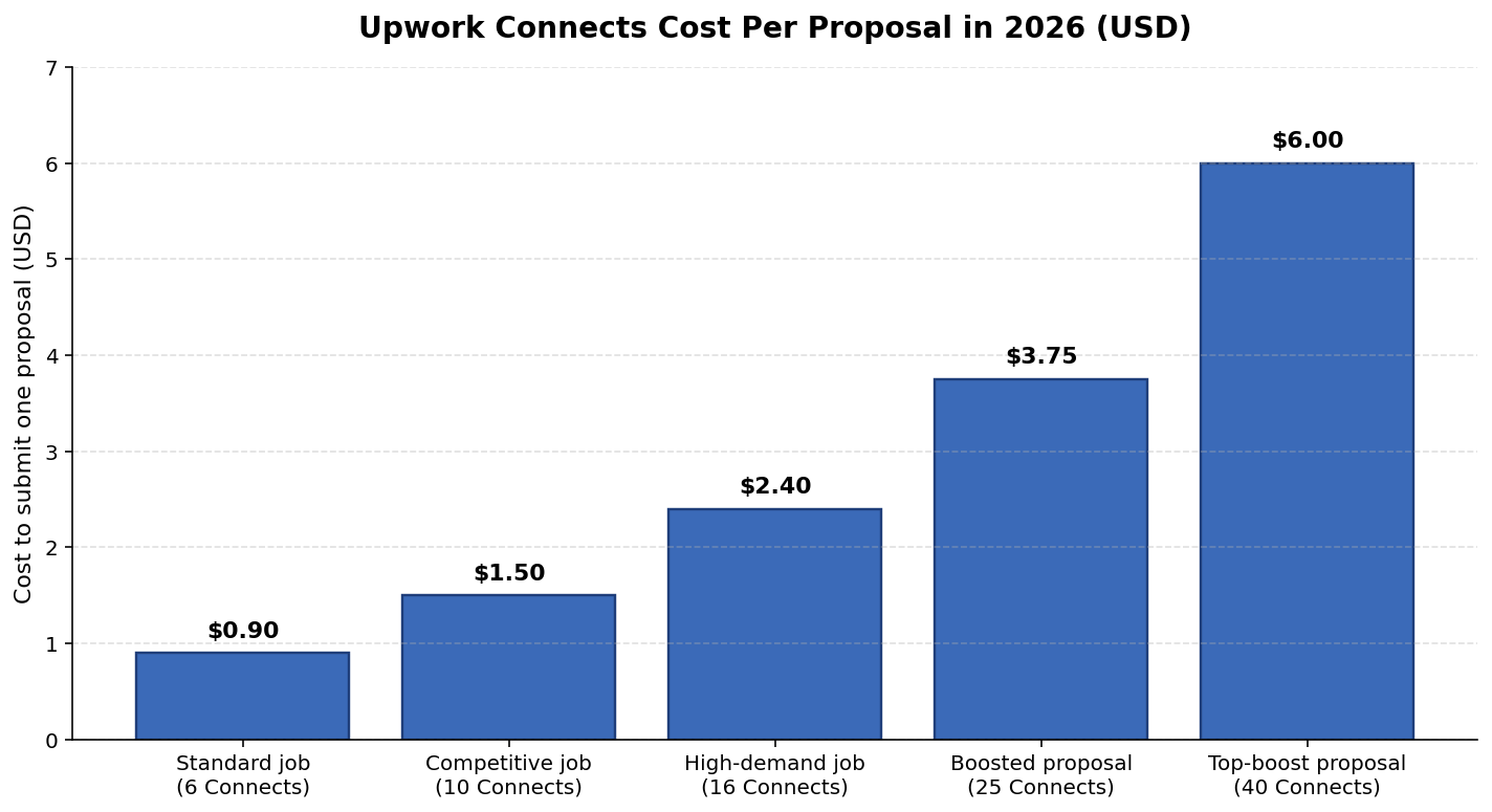 The cost to submit one Upwork proposal in 2026 ranges from $0.90 on a standard job to $6.00 on a top-boosted bid for a high-demand role. Most freelancers budget based on the base proposal cost and forget that boosted bids are where Connects spend actually snowballs.